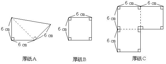 図のような形をした厚紙A、B、Cがそれぞれ何枚かあります。AおよびCの厚紙は点線で必ず折り曲げ、これらの厚紙を何枚かつなげて、立体を作ります。ここで、「つなげる」とは等しい長さの辺どうしをくっつけることを意味します。また、Cの厚紙の中で、等しい長さの辺どうしをくっつけてもよいとします。つなげた辺でも必ず折り曲げ、他の部分では折り曲げないものとします。また、厚紙は裏返して使ってもよく、厚さは考えないものとします。