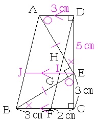 このことと四角形ABCDが台形であることから、四角形ABFDは平行四辺形となり、さらに、三角形ABEと三角形HGEは相似(ピラミッド相似)となります。
